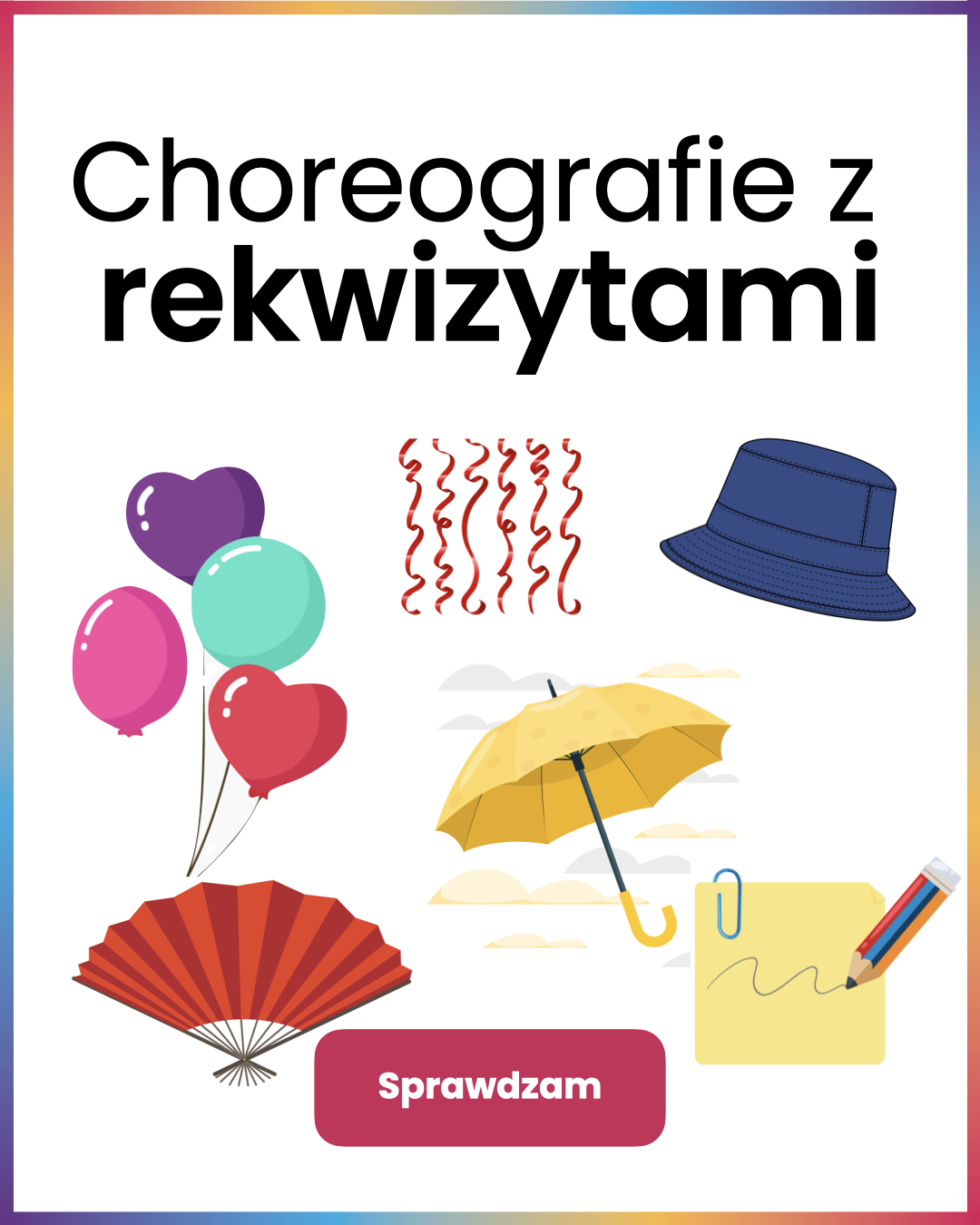 Pakiet tańców z rekwizytami, które na pewno masz w swojej sali wzbogacają ruch poprzez zabawę z różnorodnymi przedmiotami. Krzesła, papierowe wachlarze czy balony dodają tańcom charakteru, ułatwiają dzieciom wyrażanie emocji…
