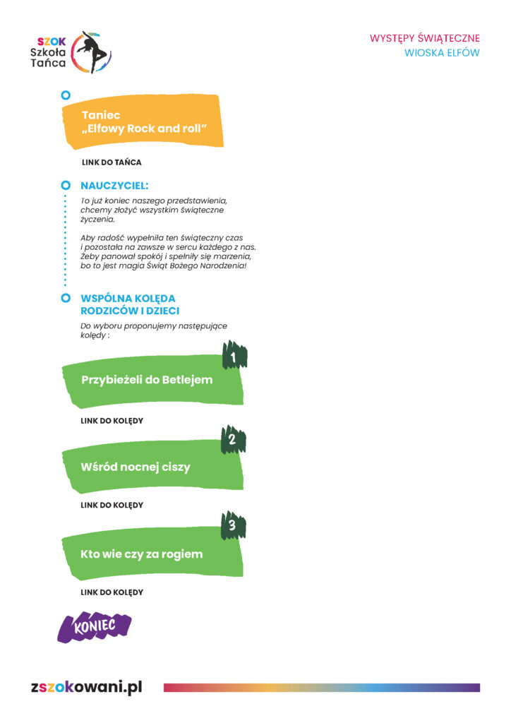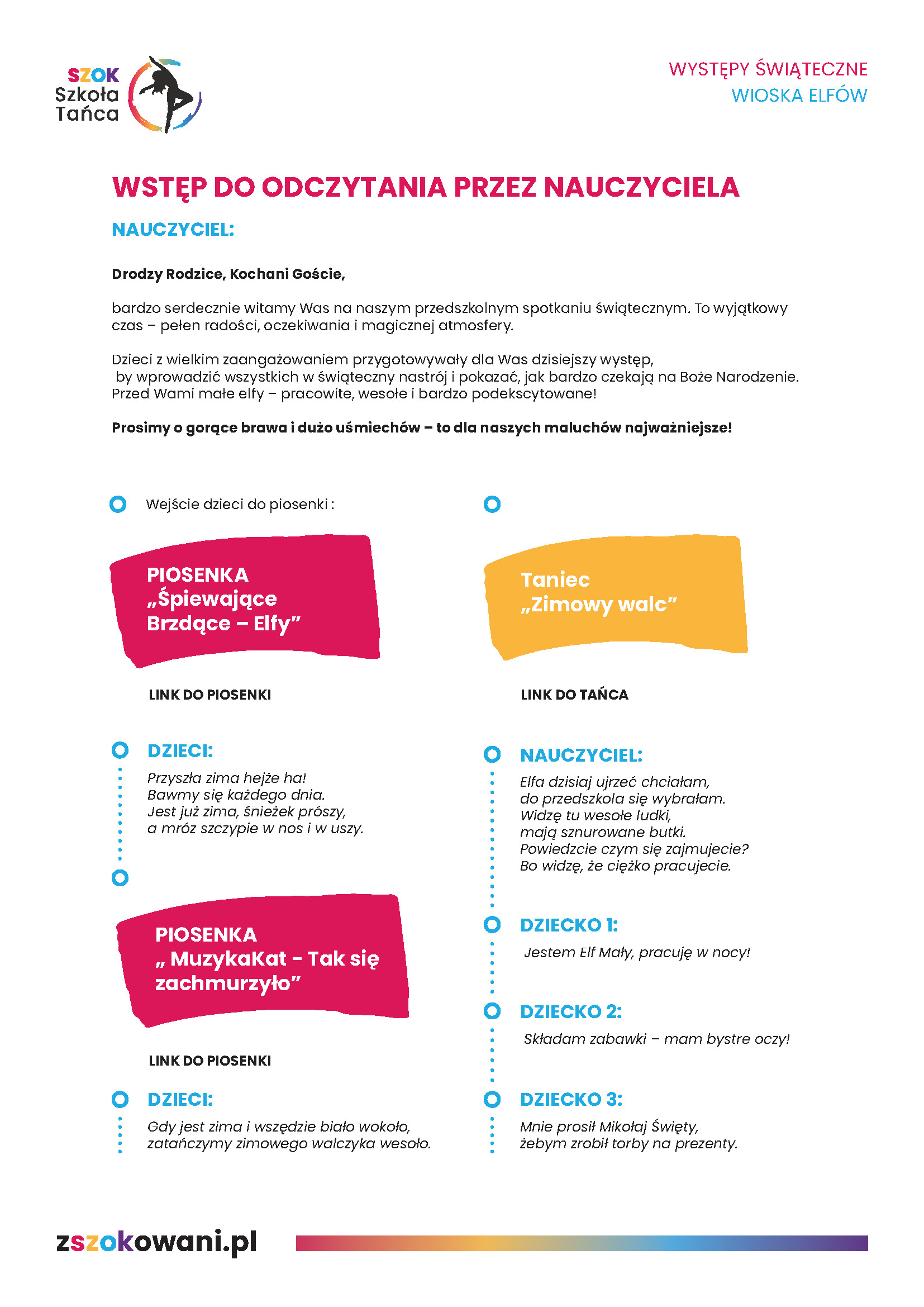 Występy świąteczne w przedszkolu to wyjątkowa okazja. Nasz autorski scenariusz „Wioska Elfów” został opracowany specjalnie z myślą o nauczycielach szukających gotowych choreografii tanecznych dla przedszkoli oraz inspiracji na układy taneczne dla najmłodszych. Motyw przewodni — magiczna wioska elfów i taneczna podróż pełna muzyki, radości i wspólnej zabawy — umożliwia prowadzenie atrakcyjnych zajęć tanecznych i animacji muzyczno-ruchowych dla dzieci.